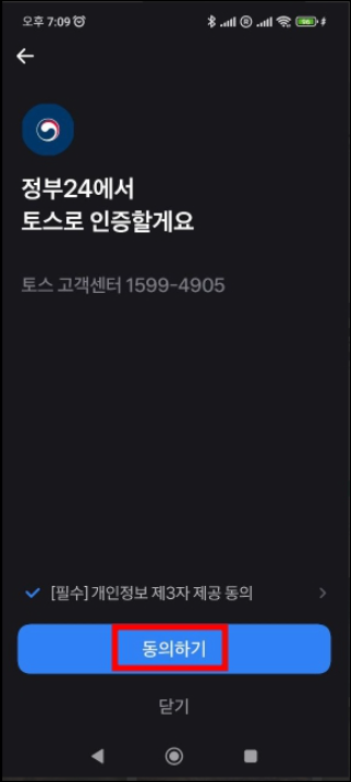 11) 휴대폰의 토스 인증요청 알람을 클릭하면 아래처럼 바로 본인인증이 가능합니다. 동의하기를 누르신 후에, 지문이나 비밀번호로 인증을 하면 바로 인증이 마무리됩니다.