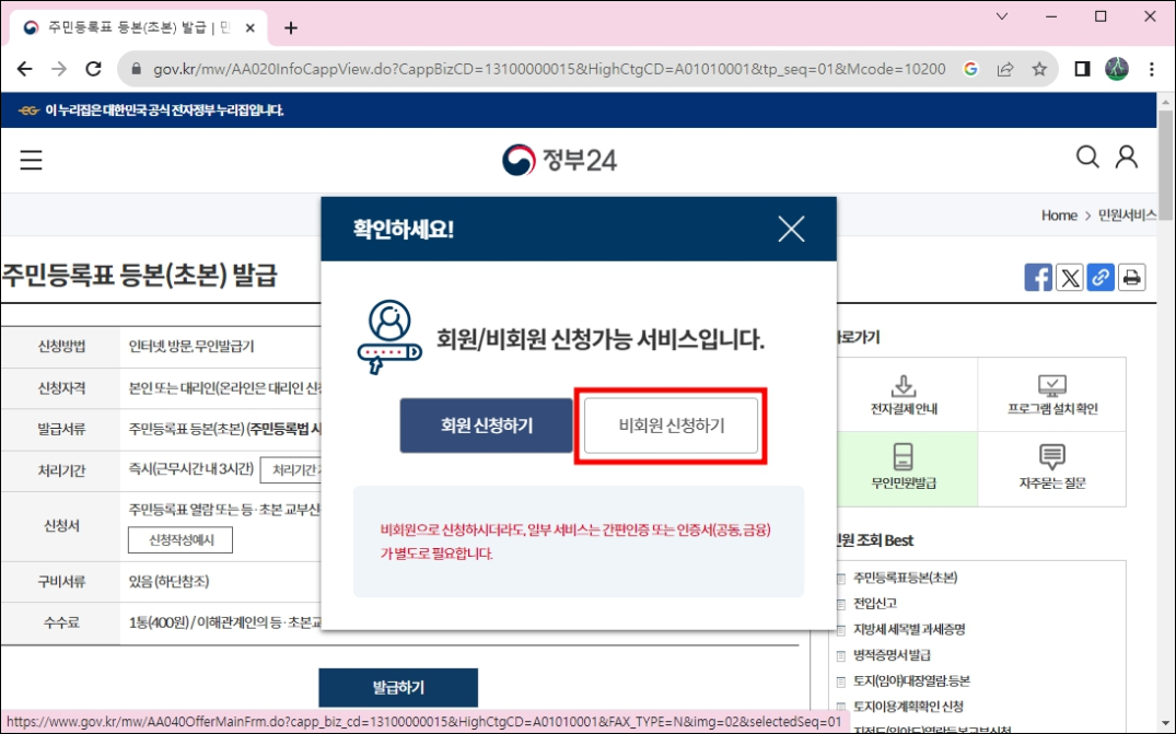 4) 비록 정부24 홈페이지에 회원가입이 되어 있지 않아도 주민등록등본 인터넷발급이 가능합니다.