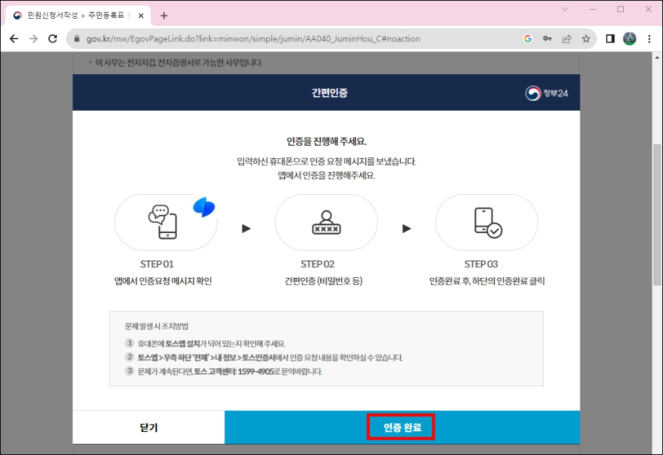 13) 개인 인증이 완료되었으면, 컴퓨터에서 인증 완료 버튼을 눌러 주세요.