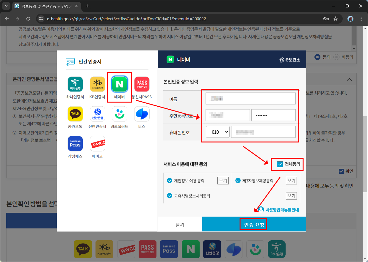 5) 아래처럼 간편인증 화면이 나오면, 인증 방법을 선택하시고, 본인인증 정보를 입력하시고, 약관동의를 해주신 후에 인증요청을 해주세요.